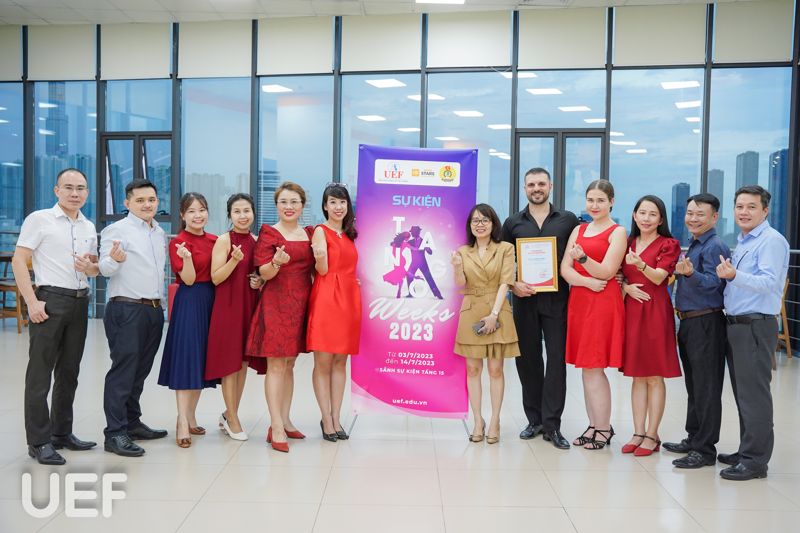 Sau một tuần triển khai chương trình Tango Weeks 2023 cho cán bộ - giảng viên - nhân viên (CB-GV-NV) Nhà UEF, chiều 14/7, Ban Chấp hành Công đoàn trường phối hợp với Viện Tây Ban Nha và Mỹ Latinh tổ chức lễ tổng kết, chúc mừng các thầy cô đã tích cực tham gia và hoàn thành các buổi học thú vị này. Tuần lễ Tango đã mang lại cho thầy cô một không gian giải trí, rèn luyện sức khỏe bổ ích sau giờ làm việc.