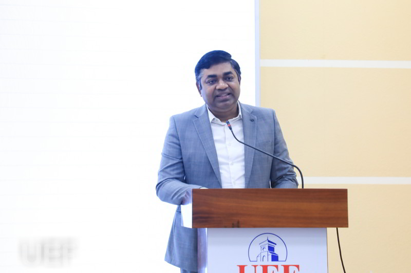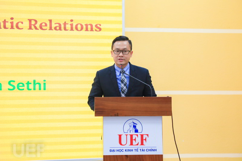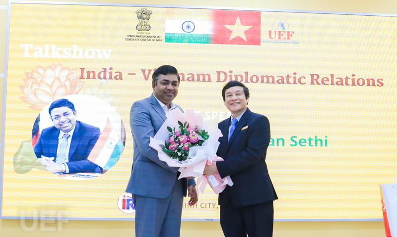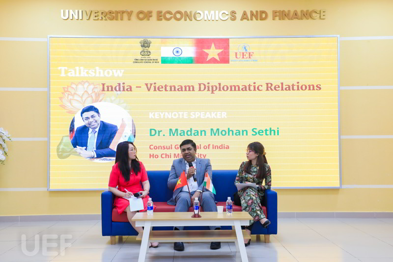 Đến với UEF lần này, Dr. Madan Mohan Sethi bày tỏ: “Tôi rất vui vì có cơ hội đến UEF để chia sẻ với các bạn sinh viên về đất nước chúng tôi và mối quan hệ giữa Việt Nam - Ấn Độ từ những năm 90 đến nay. Về mặt kinh tế, cả hai nước luôn có sự hỗ trợ, cụ thể Việt Nam đã xuất khẩu đa dạng các mặt hàng từ sản phẩm nông nghiệp, thủ công mỹ nghệ, dệt may, điện tử và các hàng hóa khác. Bên cạnh đó, Ấn Độ luôn ủng hộ, đầu tư cho Việt Nam về các mặt như chính trị, giao thông vận tải,…”.