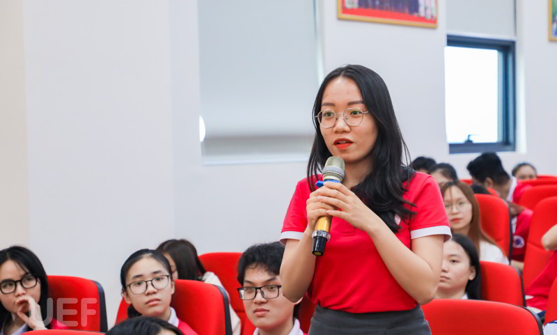 Sau phần chia sẻ từ các diễn giả, sinh viên UEF hào hứng đặt câu hỏi cho đại diện khách mời xoay quanh các vấn đề về công việc của một Tổng lãnh sự, tình hình Ấn Độ và mối quan hệ giữa hai nước trước biến động của đại dịch Covid-19,…