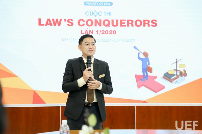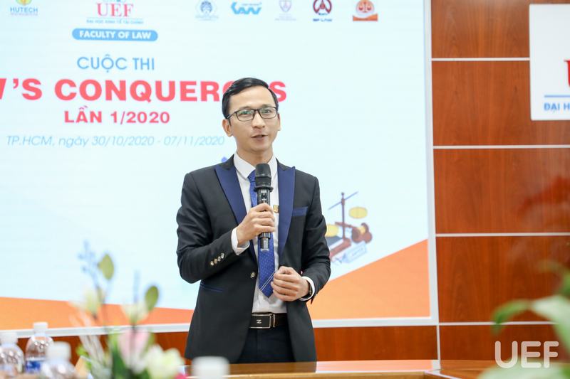 Để giúp các bạn thí sinh tự tin bước vào phòng thi, ThS. Vũ Anh Sao - Phó Trưởng khoa Luật UEF, Trưởng Ban tổ chức cuộc thi Law's Conquerors đã giới thiệu quy chế, hình thức và thời gian của các vòng thi. Đồng thời thầy thay mặt Ban tổ chức gửi lời cảm ơn đến tất cả trường đã động viên sinh viên tham gia cuộc thi ngày hôm nay.