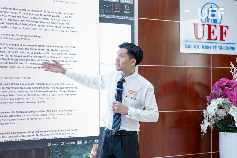 Trong phần chia sẻ của mình, TS. Trần Vang Phủ còn hướng dẫn UEFers xây dựng đề cương nghiên cứu và quy trình thực hiện. Diễn giả đã giới thiệu sơ qua về các phương pháp luận và phương pháp nghiên cứu, đặc biệt nhấn sâu vào cơ sở dữ liệu - nơi các bạn có thể tìm, đọc và nghiên cứu tài liệu, công trình nghiên cứu khoa học liên quan.