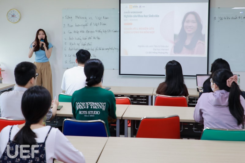 Theo đó, không chỉ cung cấp nhiều thông tin bổ ích, tại buổi chuyên đề, cô Hoàng My còn tích cực tương tác với sinh viên bằng những câu hỏi xoay quanh đề tài nghiên cứu của các bạn. Với những đề tài khác nhau, cô đã cẩn thận giúp UEFers khai thác sâu hơn các chi tiết, phân tích điểm mạnh và điểm yếu, từ đó định hướng phát triển cho các bạn ở những bước tiếp theo. Ngoài ra, những bí quyết để chinh phục Đại học Harvard, vượt qua khó khăn và tạo ra một công trình NCKH thành công cũng được diễn giả chia sẻ một cách cởi mở, thẳng thắn.