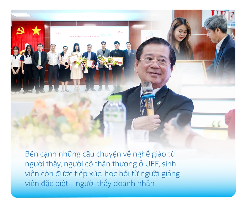 Có thể nói, trên tiến trình hội nhập và phát triển của UEF, người thầy doanh nhân đóng một vai trò quan trọng và đồng hành xuyên suốt. Thông qua sự xuất hiện với vai trò là giám khảo, cố vấn, diễn giả hay giảng viên, những thầy cô đặc biệt này đã trở thành một mắt xích quan trọng trong mô hình đào tạo của Nhà trường.
