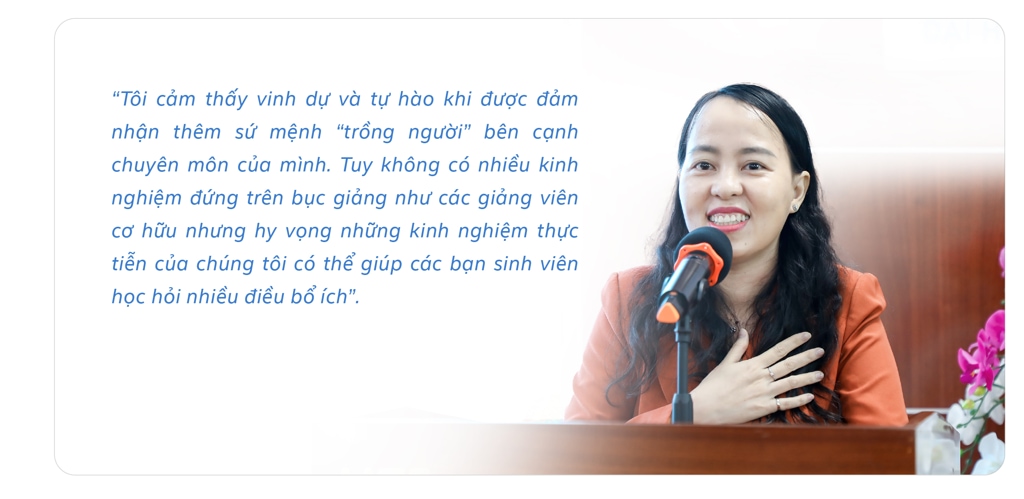 “Tôi luôn cảm thấy may mắn khi cách sinh viên đã đến với mình ở nhiều vai trò khác nhau từ tình nguyện viên, cộng tác viên đến thực tập sinh nhưng điểm chung là các bạn đều rất giỏi, chăm chỉ, cầu thị, năng động, sáng tạo, không ngại khó khăn và luôn nỗ lực tiến về phía trước. Chính năng lượng tích cực từ các bạn đã giúp mình vực dậy khi áp lực, giúp mình tiếp tục kiên trì, vững bước trên hành trình làm nghề. Thầy cô làm điểm tựa cho sinh viên và chính các bạn cũng là nguồn động lực cho thầy cô”.