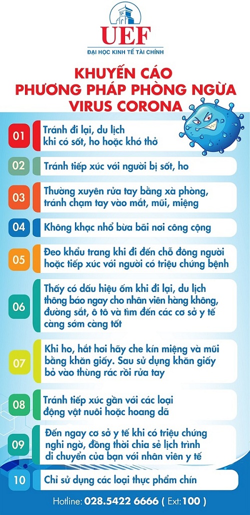 Theo thông báo số số 26/TB-UEF (ban hành ngày 6/2/2020), từ ngày 17/2/2020, học viên, sinh viên trường Đại học Kinh tế - Tài chính thành phố Hố Chí Minh (UEF) sẽ trở lại học tập bình thường. Tuy nhiên, theo diễn biến ngày càng phức tạp của virus corona (gọi tắt là nCoV) trên thế giới nói chung và tại Việt Nam nói riêng, Bộ Giáo dục và Đào tạo yêu cầu các sở giáo dục và đào tạo, các đại học, học viện, trường đại học, cao đẳng sư phạm và trung cấp sư phạm chủ động phối hợp với các sở y tế và cơ quan có liên quan của địa phương triển khai một số công việc để ngăn chặn sự xâm nhập và lây lan của dịch bệnh, chủ động ứng phó có hiệu quả nhất trong trường học. Ngày 30/01/2020, Hội đồng trường, Ban giám hiệu UEF đã chỉ đạo triển khai các biện pháp cụ thể để phòng ngừa virus Corona như sau: