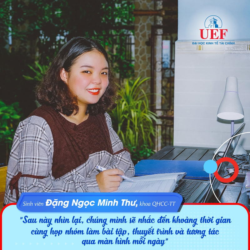 Trong khi đó, đối với bạn Đặng Ngọc Minh Thư - Sinh viên khoa Quan hệ công chúng và Truyền thông cho biết, học online là: “Kỷ niệm đáng nhớ trong suốt quãng đường Đại học. Sau này nhìn lại, chúng mình sẽ nhắc đến khoảng thời gian cùng họp nhóm làm bài tập qua điện thoại mỗi ngày, cùng thuyết trình và tương tác thông qua màn ảnh nhỏ. Do đó, mình rất trân trọng những thử thách này bởi nó giúp mình trưởng thành và tích lũy thêm nhiều trải nghiệm trong cuộc sống”.
