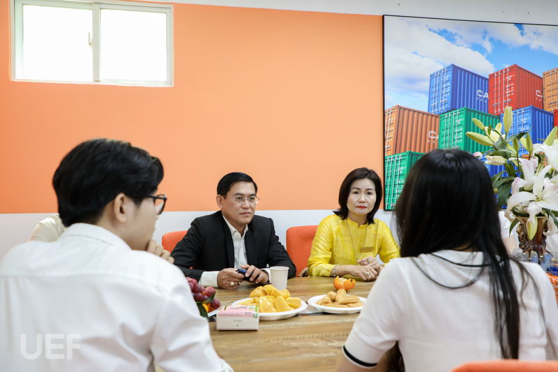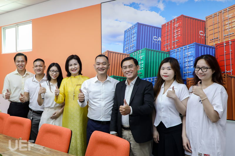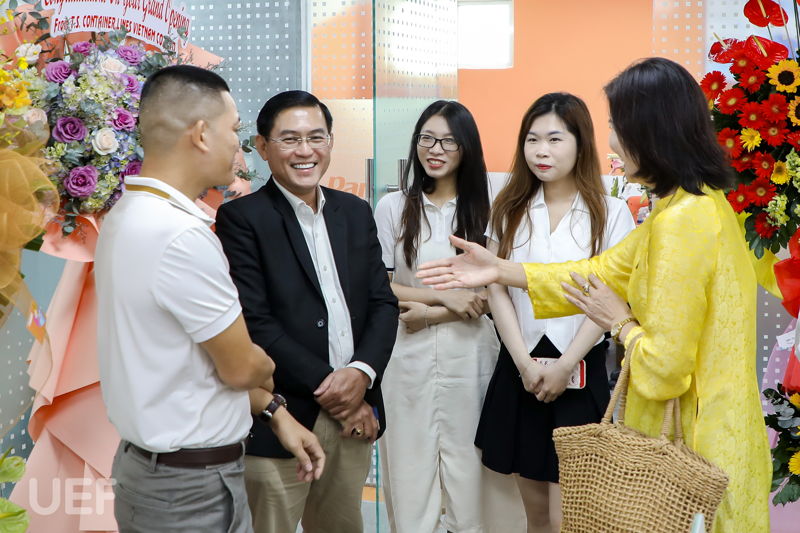 Đoàn UEF đến chúc mừng đối tác có TS. Nhan Cẩm Trí - Phó Hiệu trưởng Nhà trường, ThS. Nguyễn Thị Kim Loan - Phó Giám đốc Trung tâm Hợp tác doanh nghiệp. Đại diện Panda Logistics có ông Thân Ngọc Hiếu - Giám đốc và các anh, chị nhân viên, trong đó có 3 cựu sinh viên UEF thuộc các khóa 2015, 2017 và 2018.