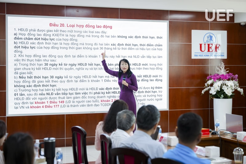 Tại buổi tập huấn, bà Nguyễn Phan Bảo Khuyên - Luật gia, chuyên viên Trung tâm Tư vấn pháp luật Liên đoàn Lao động Thành phố Hồ Chí Minh đã chia sẻ nhiều nội dung thiết thực, bám sát nhu cầu thực tế của đội ngũ công đoàn viên. Trọng tâm là các quy định cốt lõi trong Bộ luật Lao động 2019, được trình bày theo hướng dễ hiểu, dễ áp dụng.