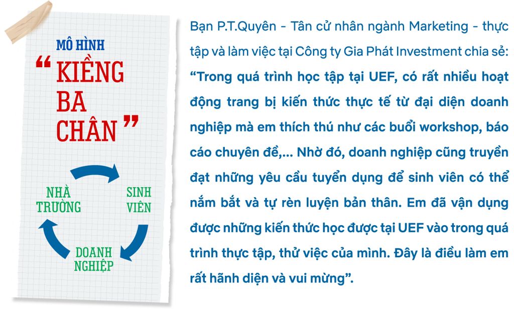 Đào tạo gắn với doanh nghiệp là mô hình xuyên suốt, luôn được bổ sung, đổi mới trong từng giai đoạn của UEF, nhằm đảm bảo trang bị cho sinh viên cầu nối tiếp xúc doanh nghiệp sớm nhất.