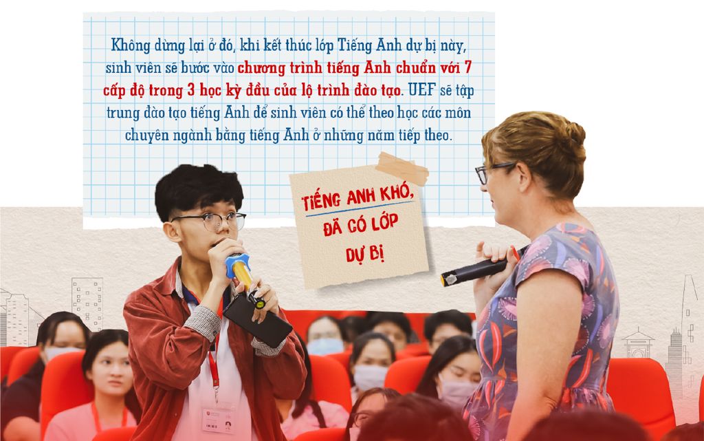 Ngay khi hoàn tất thủ tục nhập học, tân sinh viên được kiểm tra trình độ tiếng Anh đầu vào. Căn cứ vào năng lực của từng sinh viên, giảng viên sẽ tư vấn, hướng dẫn phương pháp học tiếng Anh tại UEF để đạt hiệu quả tốt nhất. UEF sẽ cung cấp chương trình "Tiếng Anh dự bị" hoàn toàn miễn phí cho các bạn. Nhà trường mong muốn củng cố cho sinh viên kiến thức tiếng Anh cơ bản và đạt trình độ tiếng Anh đầu vào của UEF, đồng thời thích ứng tốt với môi trường học.