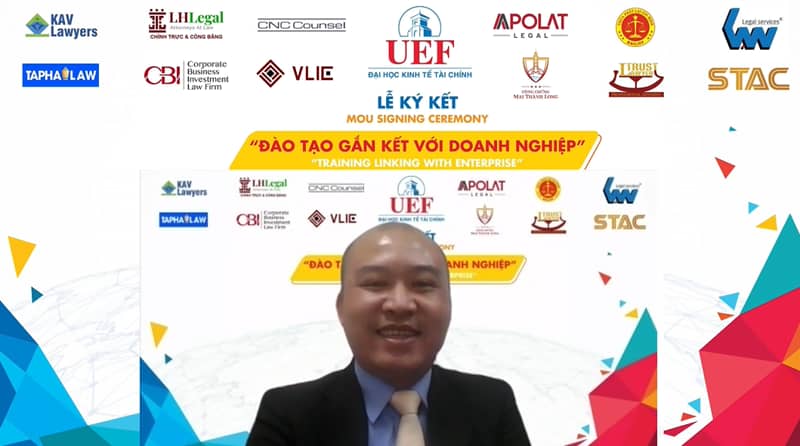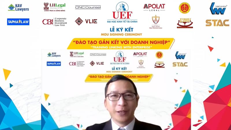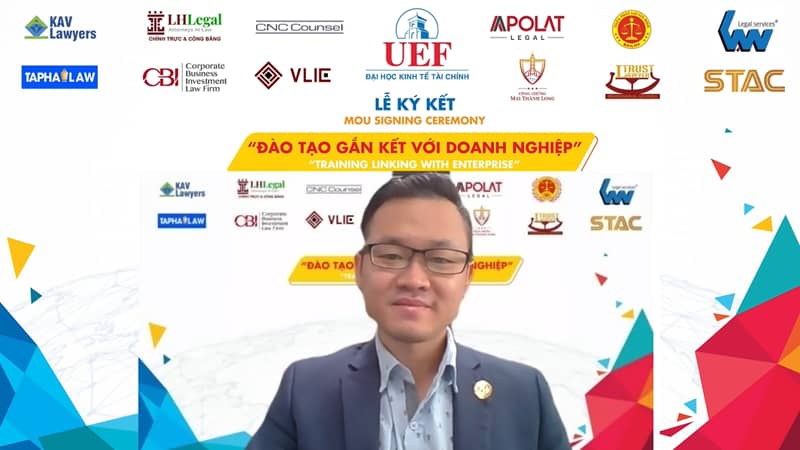 Phát biểu mở đầu chương trình, ông Đỗ Quốc Anh – Phó Chủ tịch Hội đồng trường cho biết khoa Luật tại UEF có nhiều hoạt động thực tiễn khi tổ chức nhiều cuộc thi học thuật, workshop, talkshow với các chuyên gia, luật sư từ trong và ngoài nước đến chia sẻ. Những tố chất của các bạn sinh viên khoa Luật cũng được hình thành các hoạt động giảng dạy bổ ích của các doanh nghiệp. Ông cũng nhấn mạnh vai trò của các doanh nghiệp đối với UEF và việc ký kết với các doanh nghiệp ngày hôm nay sẽ tạo ra cơ hội để sinh viên kiến tập, thực tập và nắm bắt vị trí làm việc trong tương lai.