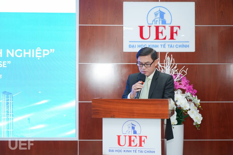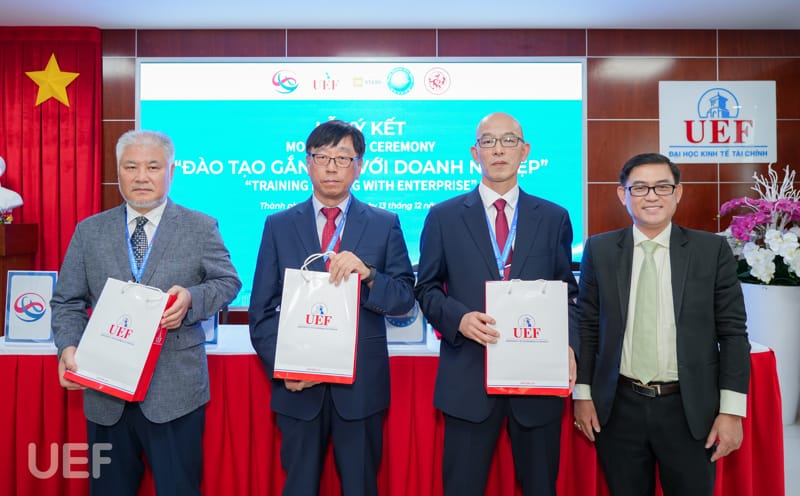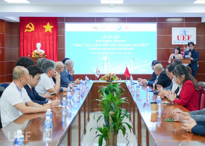 Về phía UEF có TS. Nhan Cẩm Trí - Phó Hiệu trưởng Nhà trường, ThS. Bùi Quang Đông - Trưởng phòng Công tác sinh viên, ThS. Huỳnh Quốc Phong - Giám đốc Trung tâm Hợp tác doanh nghiệp, TS. Phan Bảo Giang - Trưởng khoa Marketing, ThS. Phạm Thị Thùy Linh - Phó Trưởng khoa Ngôn ngữ và Văn hóa quốc tế cùng các giảng viên, sinh viên theo dõi.