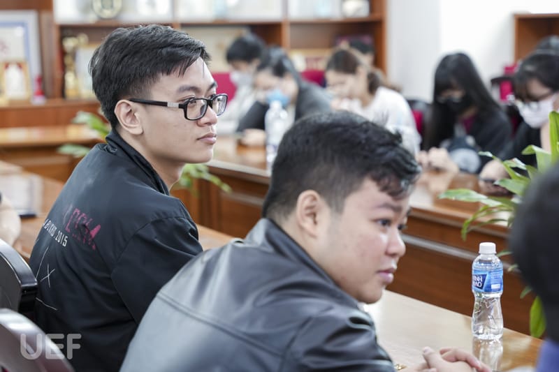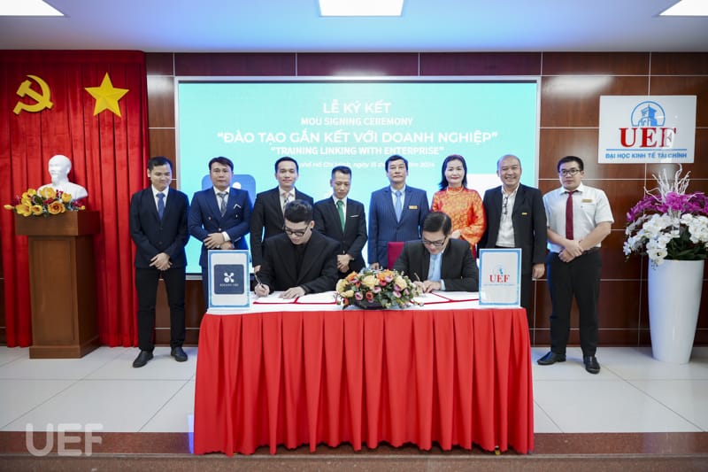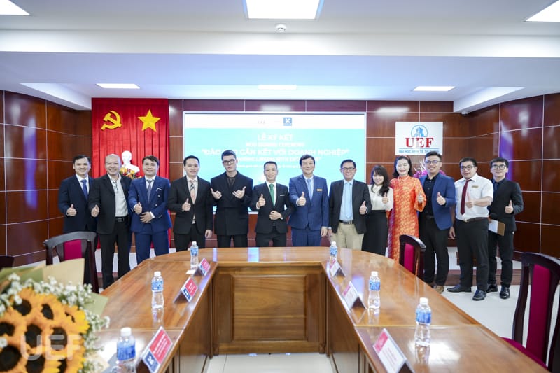 Về phía UEF có ông Đỗ Quốc Anh - Phó Chủ tịch Hội đồng trường, TS. Nhan Cẩm Trí - Phó Hiệu trưởng Nhà trường, ThS. Huỳnh Quốc Phong - Giám đốc Trung tâm Hợp tác doanh nghiệp, ThS. Bùi Quang Đông - Trưởng phòng Công tác sinh viên cùng các thầy cô là lãnh đạo đại diện các đơn vị.