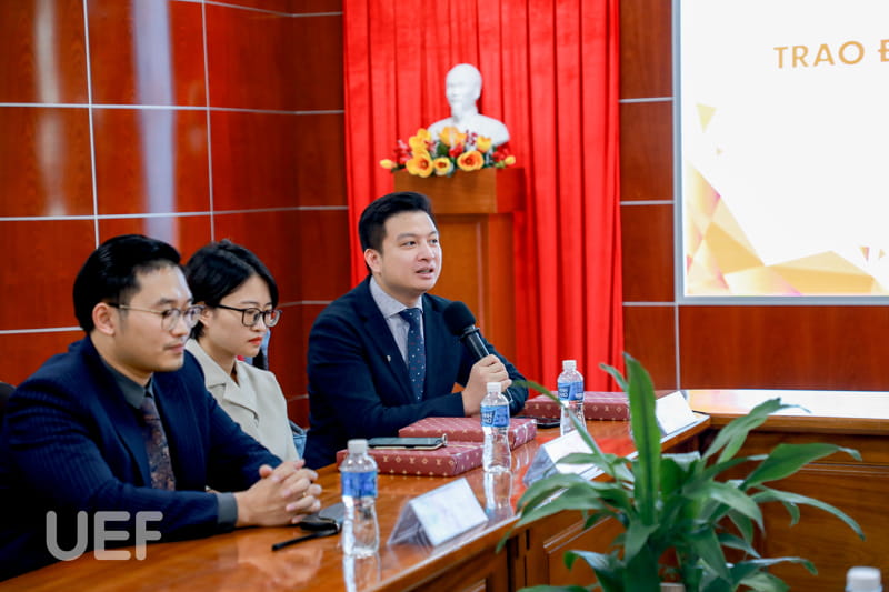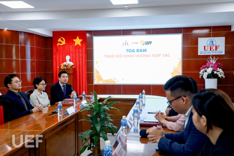 Phát biểu mở đầu chương trình, ông Đỗ Quốc Anh - Phó Chủ tịch Hội đồng trường đã giới thiệu thông tin tổng quan về UEF, đồng thời nhấn mạnh đối tác SAPP Academy là đơn vị đào tạo hàng đầu Việt Nam trong lĩnh vực kế toán, kiểm toán, tài chính và đầu tư. Việc ký kết hợp tác sẽ mang lại nhiều lợi ích cho sinh viên, hai bên cùng nhau triển khai các chương trình đào tạo, cuộc thi học thuật, hoạt động ngoại khóa để tăng cường kiến thức, rèn luyện kỹ năng thực tế cho sinh viên. Ông Quốc Anh cũng bày tỏ hy vọng về mối quan hệ hợp tác bền chặt giữa UEF và SAPP Academy trong thời gian sắp tới.