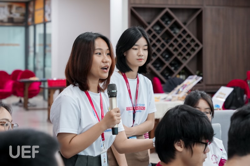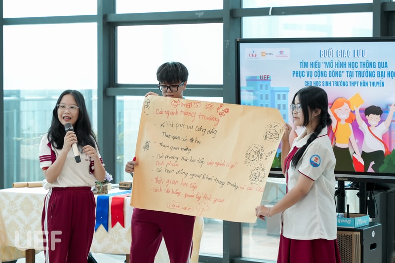 Học tập thông qua phục vụ cộng đồng là một điểm mạnh nổi bật trong chương trình đào tạo tại UEF. Sinh viên không chỉ có cơ hội áp dụng kiến thức vào thực tiễn, đời sống mà còn tạo ra những giá trị nhân văn, hỗ trợ các đối tượng, hoàn cảnh yếu thế trong xã hội. Nhận thấy những ý nghĩa của mô hình học tập đặc biệt này mang lại, đoàn học sinh trường THPT Hàn Thuyên đã đến trường để tìm hiểu về những hoạt động cụ thể vào sáng ngày 25/7. Tại đây, các bạn đã gặp gỡ và lắng nghe những câu chuyện thực tiễn từ các anh, chị sinh viên. Sau buổi giao lưu, nhiều bạn trẻ bày tỏ sự thích thú và mong muốn sẽ trở thành những "mảnh ghép" của Trung tâm Kết nối cộng đồng (CSL) nếu học tập tại UEF sau này.