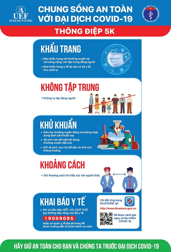 1. Yêu cầu sinh viên toàn trường thực hiện tốt thông điệp 5K của Bộ y tế, đặc biệt là bắt buộc đeo khẩu trang trong và ngoài Trường/lớp học, khi ra đường, tại nơi công cộng, các khu vui chơi, giải trí, các sự kiện có tập trung đông người, trên các phương tiện giao thông công cộng.