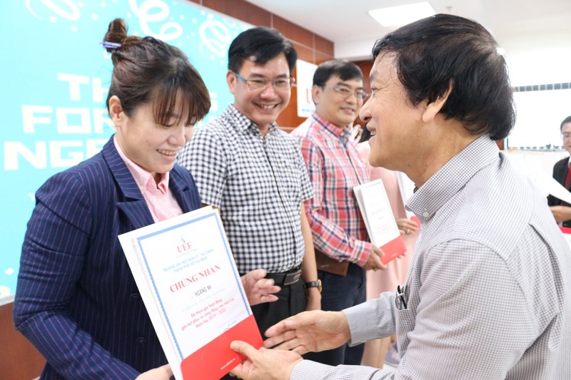 Thầy Đỗ Quốc Anh - Phó Chủ tịch Hội đồng trường trao giấy chứng nhận cho các thầy cô đã tâm huyết với mô hình áp dụng Service – Learning vào môn học