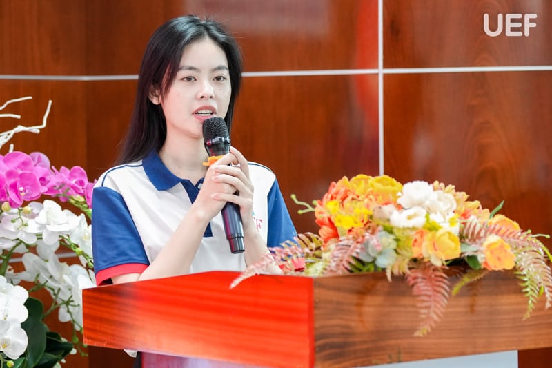 Đại diện sinh viên nhận quà Tết, bạn Nguyễn Thanh Luyến - sinh viên năm 2 Khoa Quản trị du lịch - Khách sạn UEF, bày tỏ sự trân trọng và biết ơn trước phần quà cùng những lời động viên ý nghĩa từ Nhà trường và thầy cô giúp bạn có thêm động lực phấn đấu trong học tập và cuộc sống.