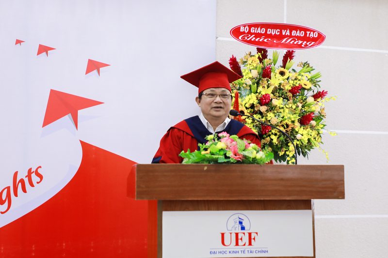 Mở đầu buổi lễ, TS. Nguyễn Thanh Giang – Hiệu trưởng UEF khẳng định: “Với sứ mệnh đào tạo nguồn nhân lực chất lượng cao đáp ứng nhu cầu xã hội và hội nhập toàn cầu, UEF luôn tạo điều kiện cho học viên phát huy tối đa khả năng và tiềm năng tại môi trường học tập - nghiên cứu quốc tế". Thầy cũng chia sẻ thêm, để có được kết quả như hôm nay là nhờ sự nỗ lực, cố gắng của bản thân mỗi học viên và công lao của những giảng viên đã luôn đồng hành trong chặng đường chinh phục tri thức. Trước bước ngoặt quan trọng của các tân Thạc sĩ, thay mặt Nhà trường thầy cũng gửi những lời chúc mừng các tân Thạc sĩ sẽ gặt hái được nhiều thành tựu mới tại cơ quan công tác. UEF rất hoan nghênh các anh, chị sẽ tiếp tục quay lại học tập hoặc cộng tác trong tương lai.