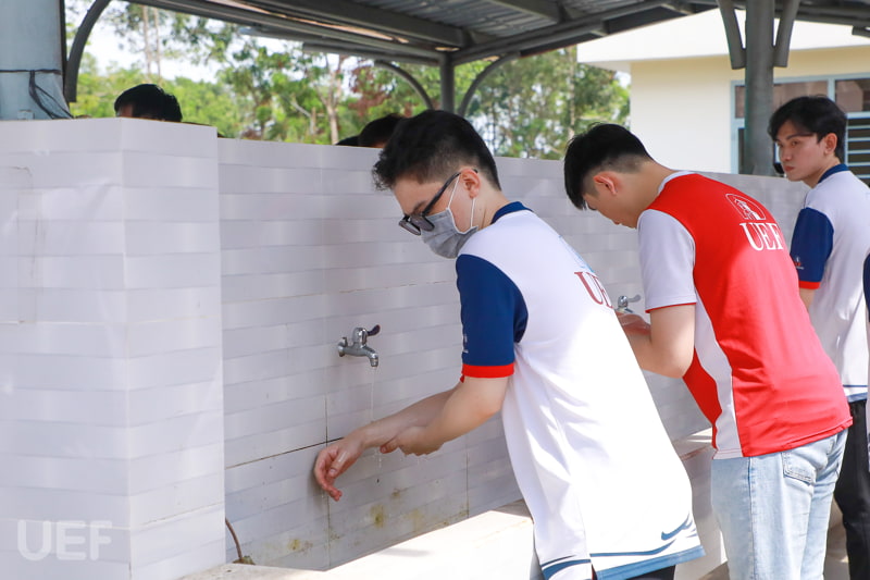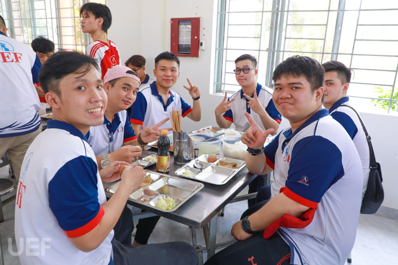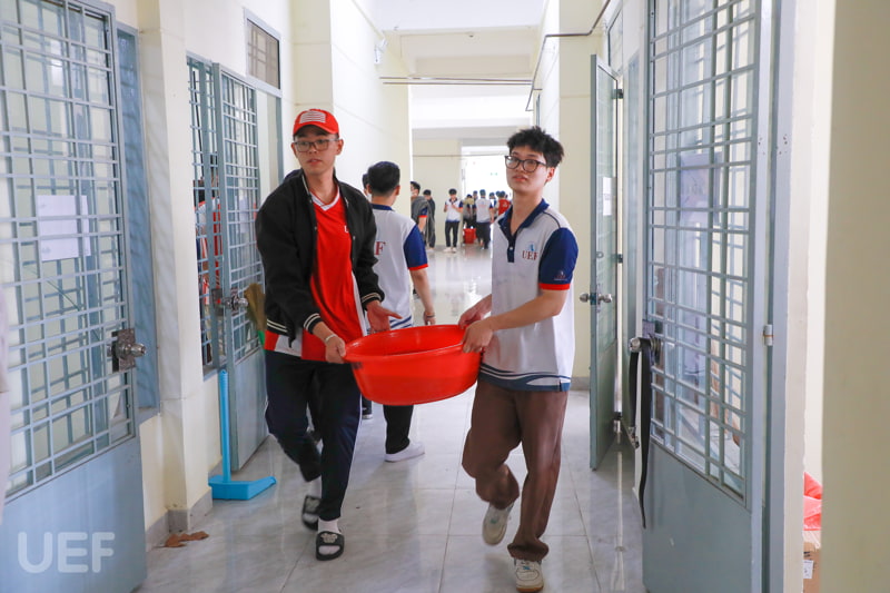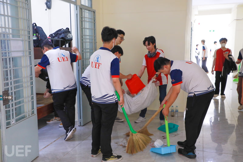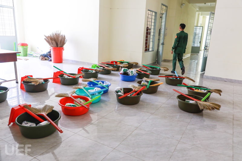 Hoàn thành công tác điểm danh nhận phòng, các bạn tiến hành thu dọn, sắp xếp chỗ nghỉ gọn gàng, sạch sẽ. UEFers cũng được trải nghiệm bữa cơm lính trong ngày đầu tiên, học nội quy và nhận quân phục.