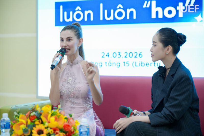 Tiếp nối chương trình, Ms. Micka Chu đã mang đến những chia sẻ gần gũi, thực tế và giàu năng lượng. Từ trải nghiệm cá nhân trong môi trường làm việc đa quốc gia, cô nhấn mạnh vai trò của ngoại ngữ như một “chìa khóa” giúp mở rộng cơ hội. Tuy nhiên, theo diễn giả, việc học ngôn ngữ không dừng lại ở kỹ năng mà quan trọng hơn là khả năng giao tiếp và thấu hiểu người đối diện. Những lời khuyên về cách học ngoại ngữ hiệu quả, cách sắp xếp thời gian và cân bằng giữa công việc - cuộc sống đã giúp UEFers có thêm định hướng rõ ràng trong quá trình phát triển bản thân.