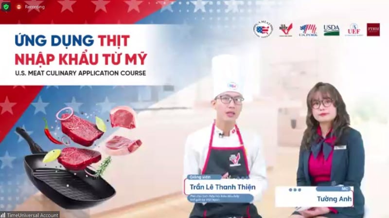 Thực hiện chuỗi chương trình “Ứng dụng thịt nhập khẩu từ Mỹ”, khoa Quản trị du lịch – khách sạn UEF đã phối hợp cùng Hiệp hội Xuất khẩu thịt của Mỹ - U.S. Meat Export Federation tạo ra môi trường học tập thú vị dành cho UEFers. Đây là hoạt động chia sẻ các kiến thức về thịt đỏ của Mỹ thông qua việc áp dụng vào các món ăn Việt một cách hài hòa, đẹp mắt và ngon miệng. Chuyên đề 1, 2 của chương trình diễn ra vào ngày 4, 5/12 vừa qua, thu hút sự tham gia của đông đảo sinh viên UEF có niềm đam mê ẩm thực nói chung và các bạn đang theo đuổi các ngành học lĩnh vực nhà hàng, khách sạn nói riêng.