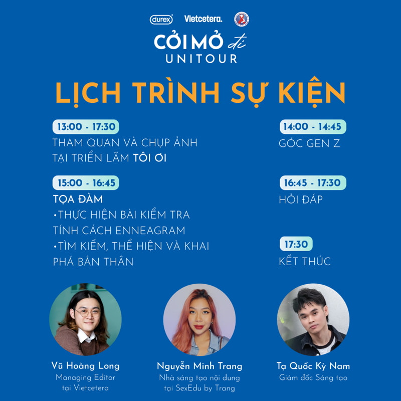 Đối với tọa đàm, các bạn sẽ lắng nghe những kinh nghiệm, trải nghiệm thực tế cũng như đúc kết những thông tin được chia sẻ xuyên suốt Unitour với sự đồng hành của 3 diễn giả gồm: anh Vũ Hoàng Long – Managing Editor tại Vietcetera, chị Nguyễn Minh Trang – Nhà sáng tạo nội dung tại SexEdu by Trang, anh Tạ Quốc Kỳ Nam – Giám đốc sáng tạo.