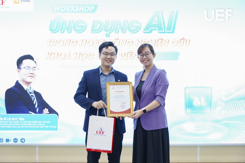 Tại workshop, TS. Lê Duy Tân đã thổi “một làn gió mới” vào thế giới nghiên cứu khoa học của sinh viên UEF, bằng những chia sẻ đầy tâm huyết về ứng dụng AI. Không chỉ là những kiến thức khô khan, diễn giả còn truyền tải cảm hứng khám phá và sáng tạo, giúp sinh viên nhận ra tiềm năng vô hạn của AI trong hành trình chinh phục tri thức.