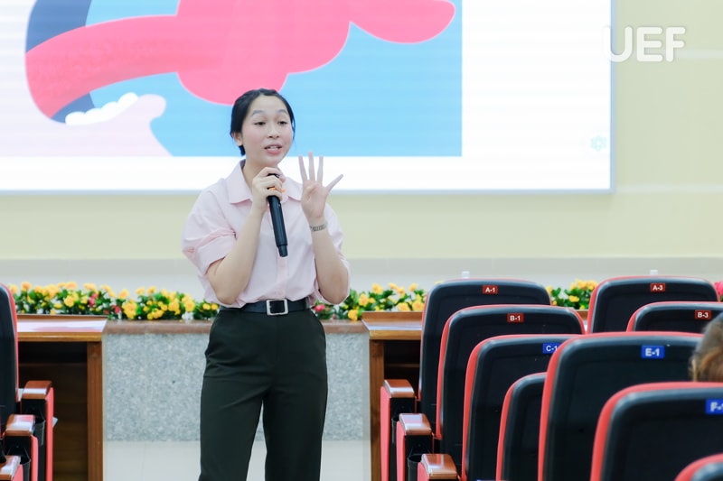 Đồng hành với sinh viên trong chương trình có cô Huỳnh Tâm Nguyệt Ánh, hiện đang là giáo viên giảng dạy tiếng Anh tại Hệ thống Anh ngữ Jaxtina. Từng có thời gian du học tại Úc cùng đa dạng kinh nghiệm trong việc gây ấn tượng với nhà tuyển dụng, diễn giả đã mang đến cho UEFers những góc nhìn thú vị xoay quanh các kỹ năng cần thiết khi phỏng vấn.