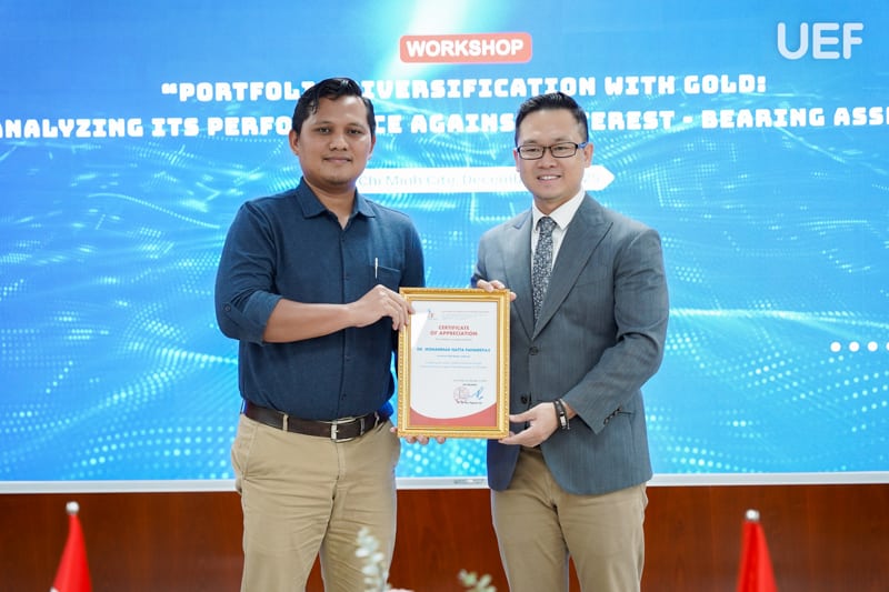 Mở đầu buổi workshop, TS. Mohammad Hatta Fahamsyah đã phân tích bối cảnh kinh tế hiện nay, chỉ ra những thách thức phổ biến mà nhà đầu tư trẻ thường gặp và lý giải vì sao vàng giữ vai trò “trọng số beta thấp” trong danh mục. Thông qua việc đối chiếu dữ liệu giữa vàng và các tài sản sinh lãi như tiền gửi hay trái phiếu, diễn giả giúp UEFers nhận diện các sự khác biệt về mức độ biến động, hiệu suất và rủi ro trong từng giai đoạn thị trường.