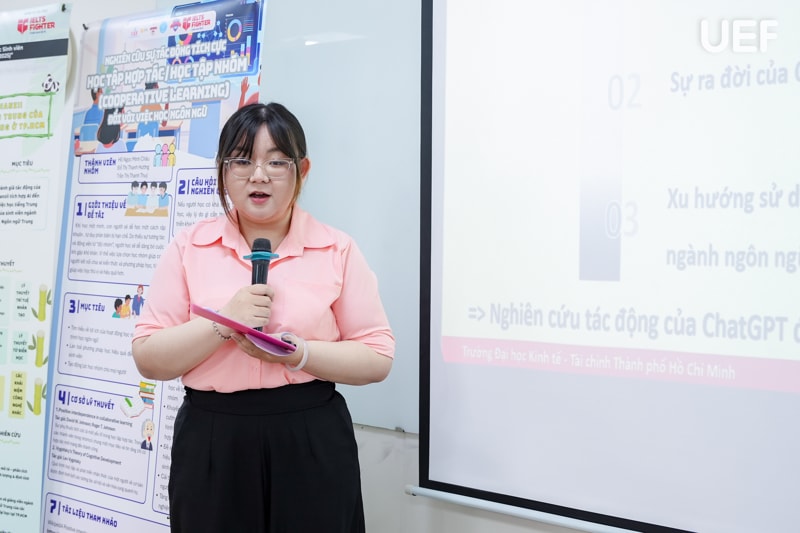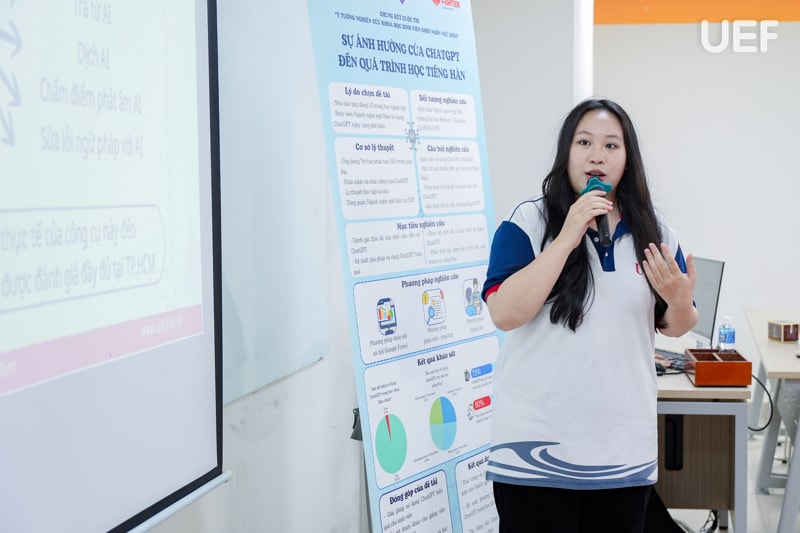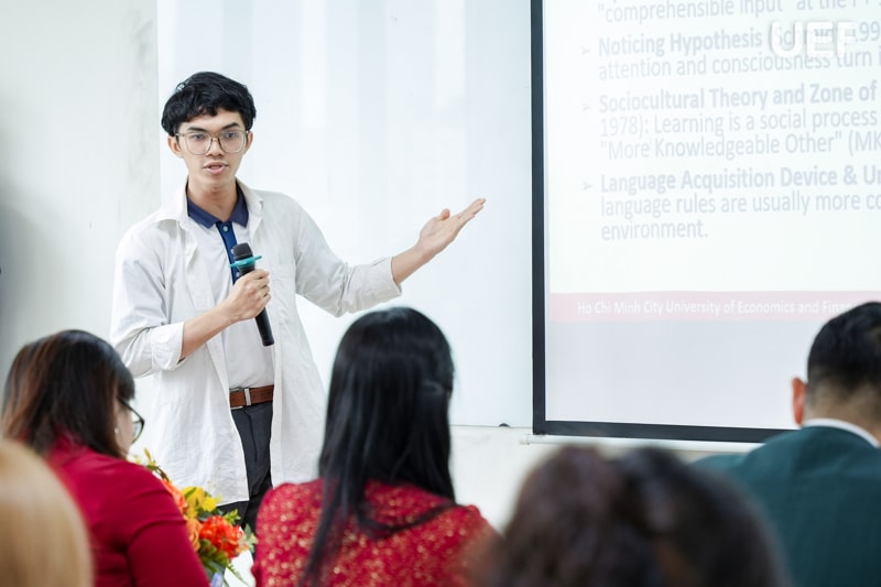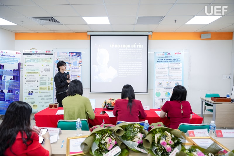Ở bảng thi tiếng Anh, 4 công trình nghiên cứu đã thể hiện rõ năng lực hội nhập quốc tế và tư duy học thuật của sinh viên UEF. Các đề tài không chỉ bám sát lĩnh vực ngôn ngữ học ứng dụng mà còn mở rộng sang những xu hướng giáo dục hiện đại, cho thấy sự cập nhật tri thức và khả năng tiếp cận vấn đề dưới góc nhìn toàn cầu.