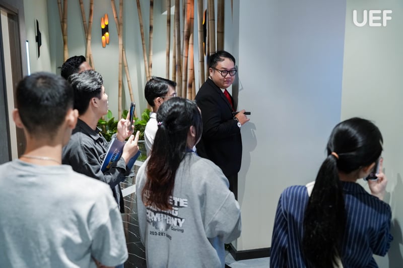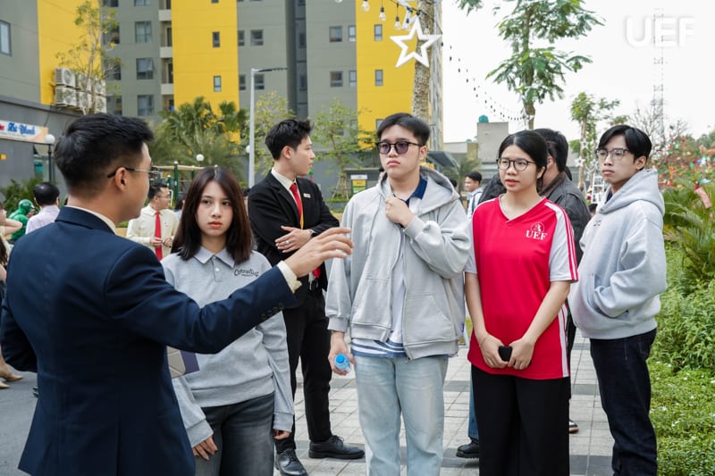 Để tạo điều kiện cho sinh viên được trực tiếp trao đổi với những người có chuyên môn cao trong ngành, các bạn được chia nhóm và tiếp tục đi tham quan thực tế dưới sự dẫn dắt của các leader. UEFers lần lượt được tham quan phố đi bộ ngay dưới căn hộ, khu vực sảnh và các tiện ích dưới chân tòa nhà, qua đó giúp các bạn có cái nhìn thực tế hơn về môi trường, không gian sống và cách thức vận hành của một khu đô thị hiện đại.