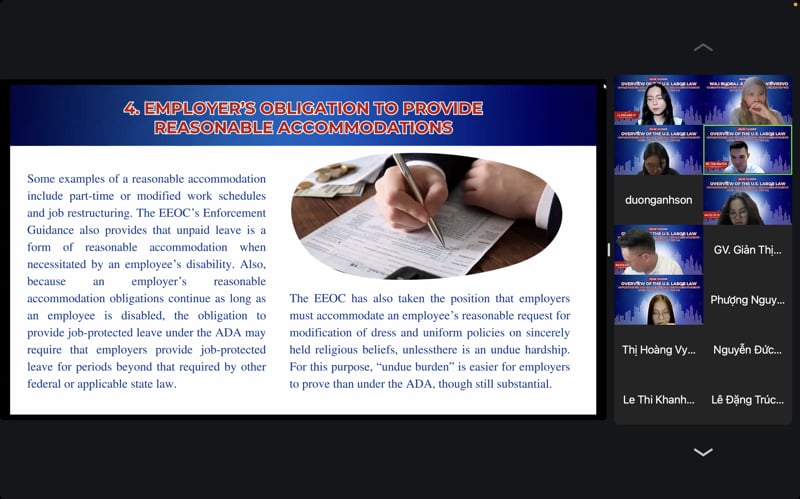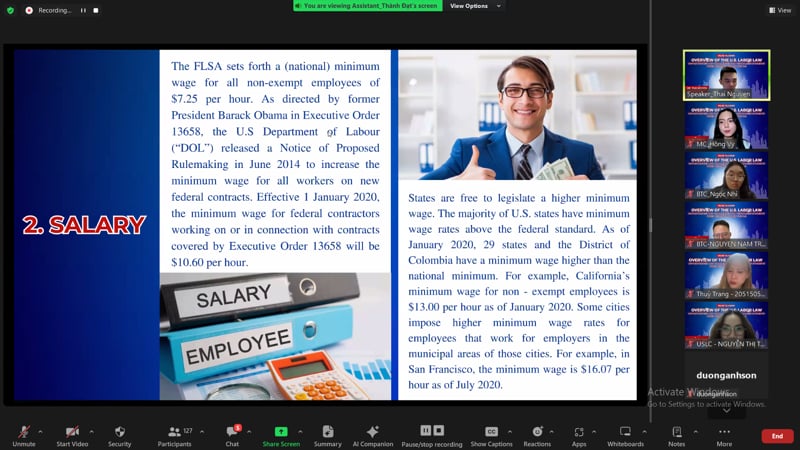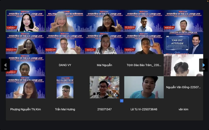 Nhằm giúp các bạn sinh viên Nhà UEF mở rộng kiến thức thực tế về lĩnh vực Luật Lao động tại Hoa Kỳ, thách thức và cơ hội khi sinh viên Việt Nam tìm kiếm việc làm ở Mỹ, tối ngày 25/5, Trung tâm Pháp luật Hoa kỳ (USLC) thuộc Khoa Luật UEF kết hợp cùng CLB Pháp luật UEF (ILC) đã tổ chức talkshow “Overview of The U.S. labor law Opportunities and challenges for Vietnamese students when getting a job in the U.S”. Chương trình diễn ra trực tuyến và thu hút sự tham dự của lãnh đạo, giảng viên cùng đông đảo sinh viên Khoa Luật.