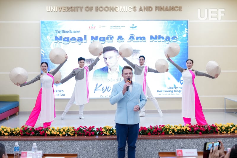 Trong buổi giao lưu, khách mời Kyo York đã chia sẻ gần gũi về hành trình học tập, phát triển sự nghiệp và tình yêu âm nhạc, đồng thời giới thiệu cách kết hợp âm nhạc với học ngoại ngữ, từ luyện nghe qua ca khúc, phát âm tự nhiên cho đến ghi nhớ từ vựng và cấu trúc ngữ pháp. Những câu chuyện thực tế, dí dỏm nhưng giàu thông tin giúp các bạn sinh viên cảm thấy việc học ngoại ngữ trở nên thú vị, gần gũi và dễ áp dụng trong cuộc sống hàng ngày.