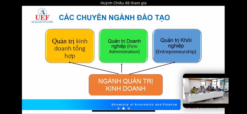 Tham gia buổi trao đổi và định hướng cho sinh viên có: TS. Lý Đan Thanh - Trưởng Khoa, TS. Huỳnh Nhựt Nghĩa, ThS. Nguyễn Ngọc Thủy Tiên - Phó Trưởng Khoa, ThS. Trần Hoàng Nam, ThS. Trần Anh Tùng - Trưởng ngành Quản trị kinh doanh cùng các thầy, cô là giảng viên Khoa và hơn 100 bạn sinh viên. Hoạt động được tổ chức trực tuyến trên nền tảng Zoom.