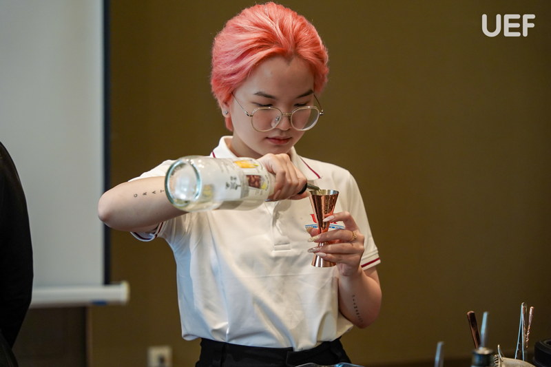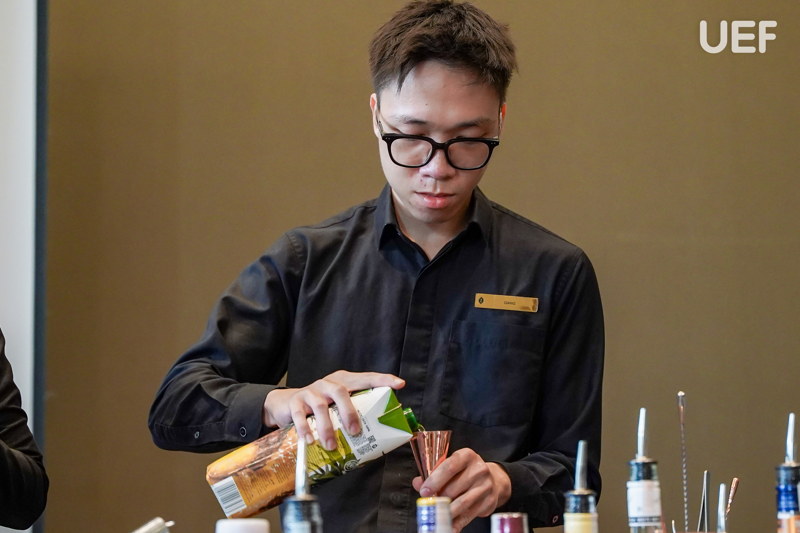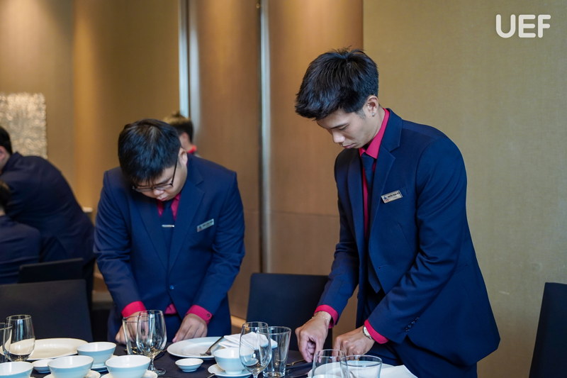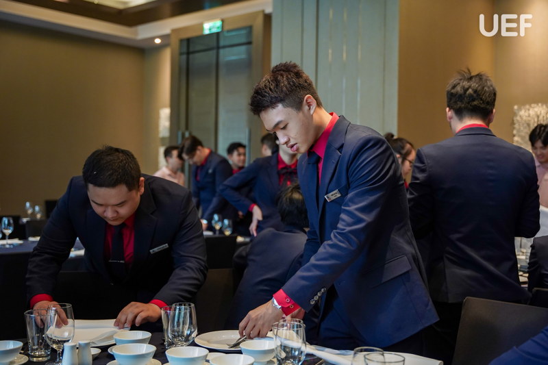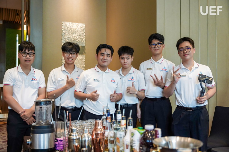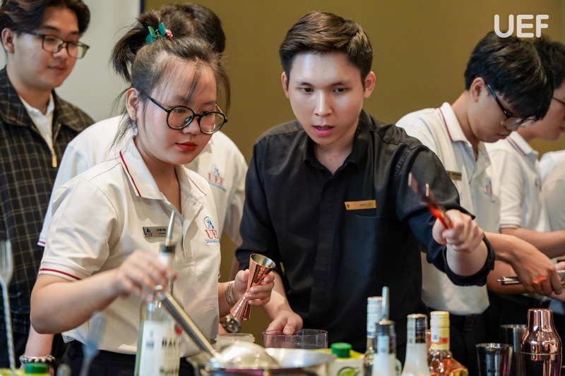 Ngày học tập chuyên sâu tại khách sạn mang đến nhiều điều thú vị trong tour học phần cho UEFers. Các bạn được chia nhóm, trực tiếp thực hành pha chế và vận hành quy trình bar, set-up bàn tiệc theo tiêu chuẩn, thực hành kỹ năng phục vụ và xử lý tình huống và tìm hiểu hoạt động của bộ phận trong nhà hàng 5 sao. Sau mỗi phần thực hành, sinh viên được chuyên viên F&B nhận xét cụ thể về thao tác, tác phong, thái độ phục vụ và kỹ năng giao tiếp. Từ đó, UEFers rút kinh nghiệm, có thêm nhiều bài học bổ ích cho hành trang nghề nghiệp về sau.