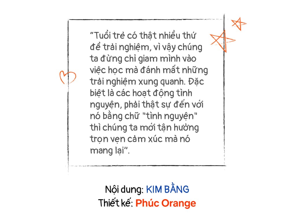 Còn nhớ những năm cấp ba, tôi chỉ biết học và học, không hề hứng thú với các hoạt động ngoại khóa hay tình nguyện. Lên đại học với suất học bổng toàn phần, tôi chú tâm hoàn toàn vào việc học để đạt được mục tiêu sẽ duy trì suất học bổng này. Cố gắng trong học tập là thế nhưng tôi luôn bị bạn bè và thầy cô nhận xét là thụ động. Những đánh giá đó là một trong những động lực thúc đẩy tôi tham gia các hoạt động ngoại khóa, đặc biệt là các chiến dịch tình nguyện.