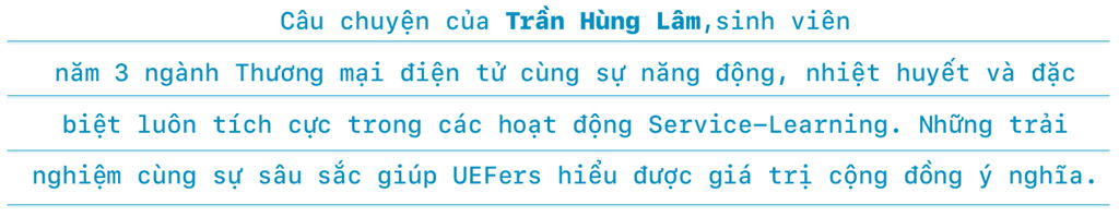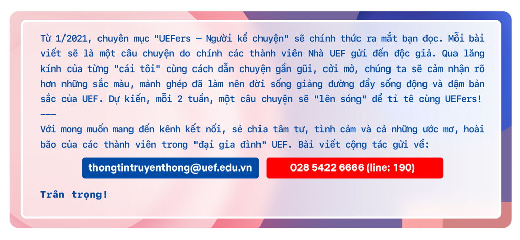 Khoảng thời gian học tập tại UEF, tôi luôn tâm đắc một câu nói, đó là “Cơ hội luôn chào đón chúng ta, hãy nắm lấy nó”. Qua câu nói này tôi muốn gửi gắm đến các bạn đang băn khoăn về bản thân và chưa tìm được nơi để tôi tỏa sáng thì các bạn hãy tự tin lên, hãy tìm cho tôi một dự án cộng đồng để làm việc, để thử thách bản thân. Khi đó, có lẽ bạn cũng sẽ giống như tôi, giúp đỡ cộng đồng cũng là giúp cho gia đình và giúp bản thân tìm được chính mình.