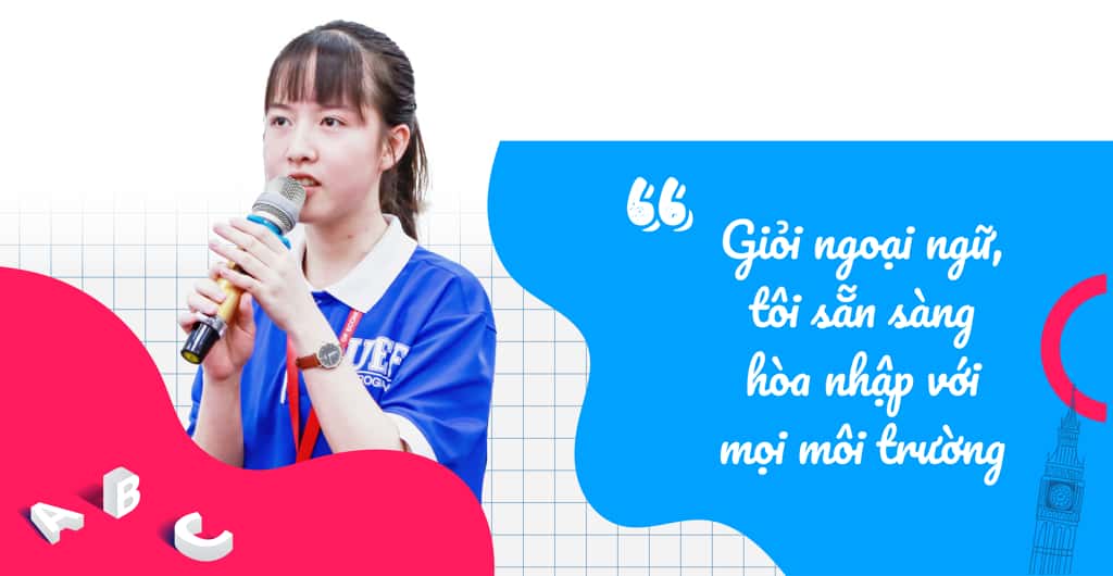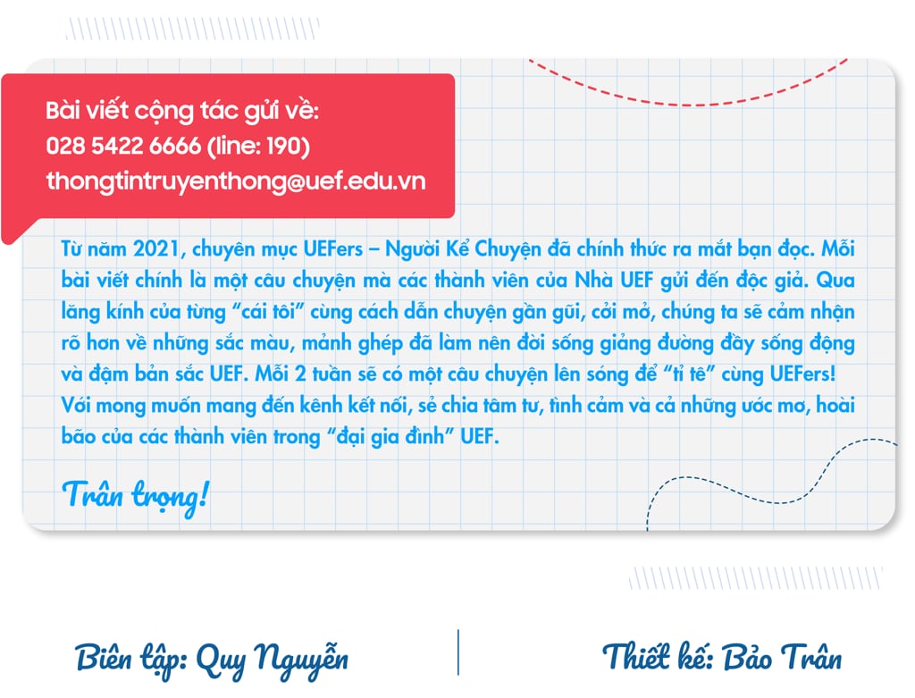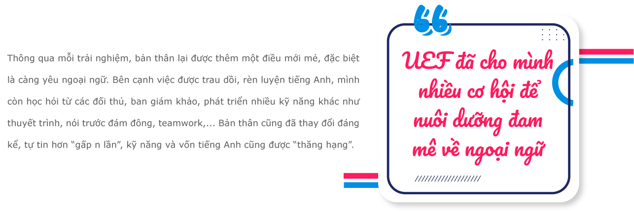 ![]() Là một người hướng ngoại nên mình cực kỳ thích tham gia các cuộc thi học thuật tiếng Anh. UEF là môi trường thuận lợi để thúc đẩy đam mê này, một số thành tựu nho nhỏ của mình có thể kể đến từ khi bước vào trường như: Quán quân cuộc thi hùng biện tiếng Anh “UEF talk master”; giải Ba cuộc thi “Your dream destination”; top 20 cuộc thi hùng biện “Speak to inspire Vietnam" được tổ chức bởi Đại sứ quán Hoa Kỳ; khách mời chương trình Cafe sáng cùng Gen Z của Saigon FM;...