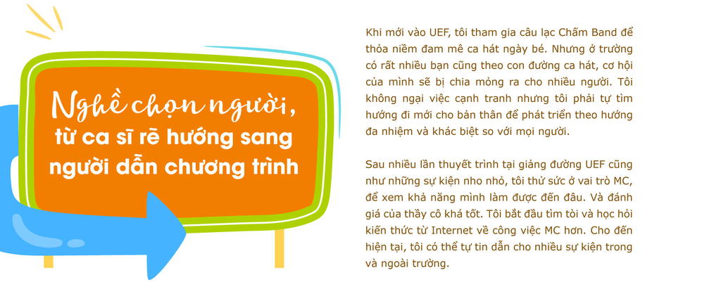 Tôi chọn UEF để theo đuổi đam mê vì tôi chọn sự tự tin, năng động. UEF là nơi tôi được bày tỏ quan điểm, góc nhìn cá nhân và không ngừng đặt câu hỏi để mở rộng và tìm hiểu tận cùng vấn đề. Bên cạnh đó, tôi được tiếp thu kiến thức chuyên môn từ thầy cô giàu kinh nghiệm và các hoạt động thú vị khác mà tôi tham gia.