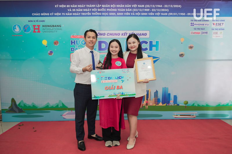 Giải Ba tại sân chơi “Hướng dẫn viên Du lịch triển vọng toàn thành lần III năm 2024” thực sự là một cột mốc đáng nhớ trong hành trình học tập và phát triển của em tại UEF. Đây không chỉ là thành quả của nỗ lực cá nhân, mà còn là sự đồng hành, động viên của thầy cô, bạn bè và cả những trải nghiệm quý báu mà em tích lũy từ ngành học của mình. Cuộc thi đã cho mình cơ hội được thử sức, học hỏi từ các bạn thí sinh tài năng và đặc biệt là khẳng định niềm đam mê với công việc hướng dẫn viên du lịch, một nghề không chỉ đòi hỏi kiến thức mà còn cần cả tình yêu với văn hóa, lịch sử và con người.