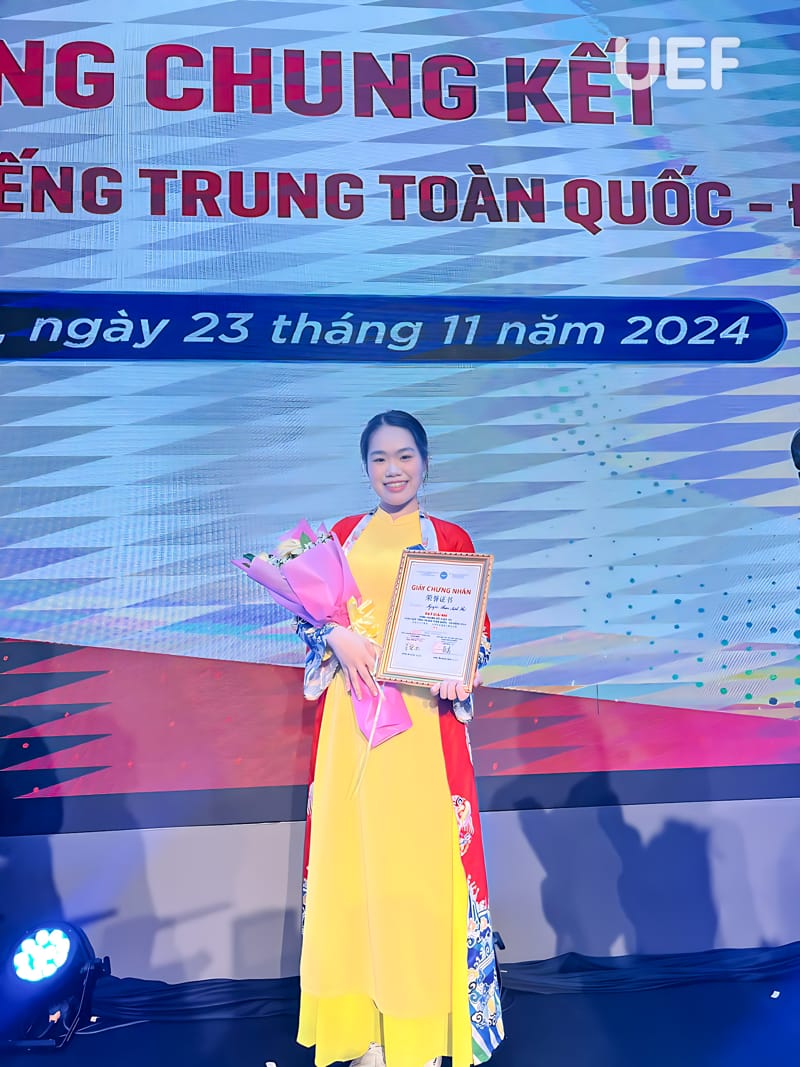 Năm vừa qua là một năm mà em gần như thoát khỏi "vùng an toàn" của mình. Em được các anh chị đi trước tin tưởng giao phó vị trí Bí thư Liên chi Đoàn khoa Ngôn ngữ và Văn hóa quốc tế, được đảm nhận vai trò Phó Chủ nhiệm CLB Hán ngữ UEF, điều này đã làm cho cuộc sống ở đại học của em phong phú hơn rất nhiều. Bên cạnh đó, em có tham gia một số cuộc thi về văn hóa nghệ thuật, học thuật,... và may mắn đều nhận được giải trong cuộc thi. Đặc biệt nhất là cuộc thi Hùng biện tiếng Trung toàn quốc tại Đà Nẵng, em đã đạt được giải Nhì chung cuộc, em thật sự rất vui và bất ngờ. Cũng trong năm 2024, có một chuyến đi để lại nhiều kỷ niệm trong em - Mùa hè xanh UEF tại Bến Tre. Nhờ có chuyến đi này, em được trải nghiệm nhiều hơn những điều chưa biết và kết nối nhiều hơn những người mà em chưa quen.