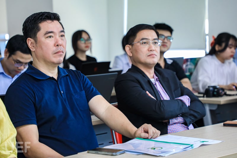 Đến dự và đánh giá sản phẩm của các nhóm sinh viên có anh Huỳnh Lê Khánh - đồng sáng lập Forgood VN - đối tác của UEF. Về phía Nhà trường có sự tham dự của TS. Nhan Cẩm Trí - Phó hiệu trưởng Nhà trường; ThS. Lý Đan Thanh - Trưởng Khoa Quản trị kinh doanh, giảng viên bộ môn Quản trị thương hiệu; ThS. Trần Thị Mỹ Phượng - Phó Giám đốc Trung tâm Kết nối cộng đồng cùng các giảng viên Khoa Quản trị kinh doanh.