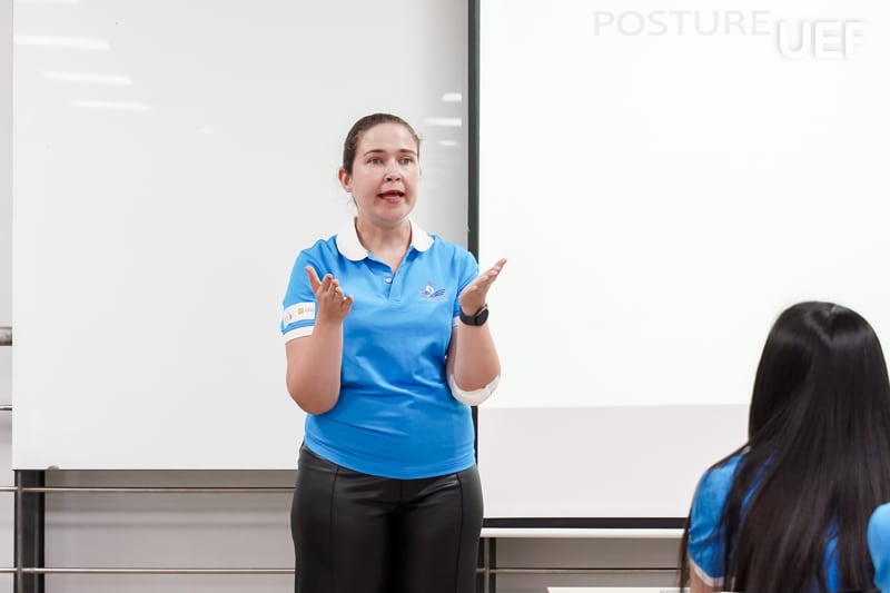 Song song đó, diễn giả đã phân tích những lỗi về hình thể khi giao tiếp thường gặp khiến sinh viên thiếu tự tin. Kết hợp với các hoạt động thực hành và trò chơi tương tác, cô đã hướng dẫn UEFers sử dụng ngôn ngữ hình thể sao cho phù hợp với từng tình huống khi giao tiếp. Diễn giả cũng nhấn mạnh tầm quan trọng của ánh mắt trong giao tiếp. Đây là yếu tố quan trọng thể hiện sự tự tin, giúp truyền tải thông điệp rõ ràng và tạo dựng niềm tin với người nghe.