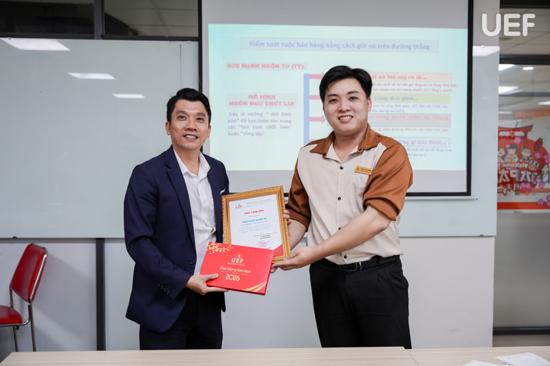Tiếp nối chuỗi hoạt động đào tạo nhân viên môi giới bất động sản chuyên nghiệp, ngày 17/1, Khoa Kinh tế UEF đã tổ chức chuyên đề 6 với chủ đề "Nghệ thuật bán hàng - Ngôn ngữ cơ thể và chia sẻ thực chiến". Buổi học tập trung vào việc trang bị cho sinh viên những kỹ năng bán hàng tinh tế, đặc biệt là nghệ thuật sử dụng ngôn ngữ cơ thể trong tư vấn bất động sản.