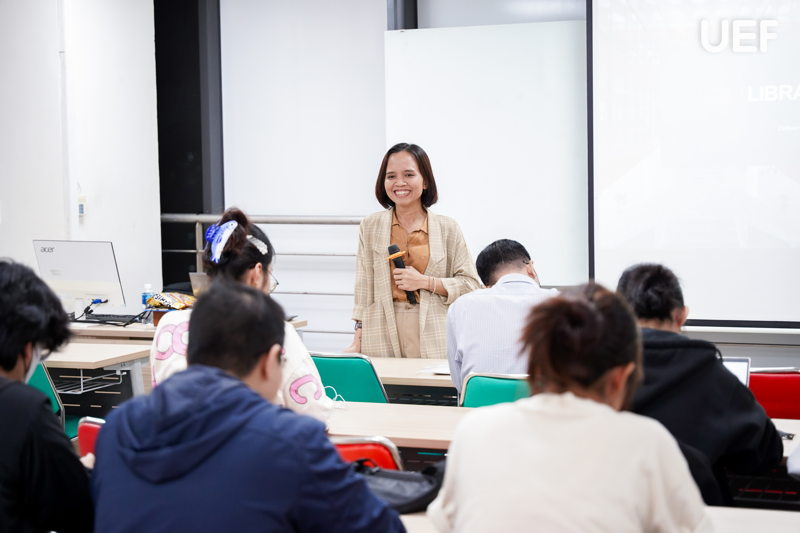 Diễn giả tập trung hướng dẫn UEFers khai thác hiệu quả các công cụ hỗ trợ, biến AI thành một trợ lý học thuật nhằm tối ưu hoá tiến trình thực hiện bài nghiên cứu. Song song đó, cô giới thiệu nhóm công cụ tiện ích giúp tổng hợp và trích dẫn tài liệu nghiên cứu theo chuẩn APA/MLA như Scipace, Research Rabbit,… Đồng thời, diễn giả phân tích sâu 5 quy trình đánh giá tài liệu, giúp sinh viên chủ động sàng lọc nguồn thông tin chất lượng và vận dụng hiệu quả trong quá trình phát triển nội dung nghiên cứu.
