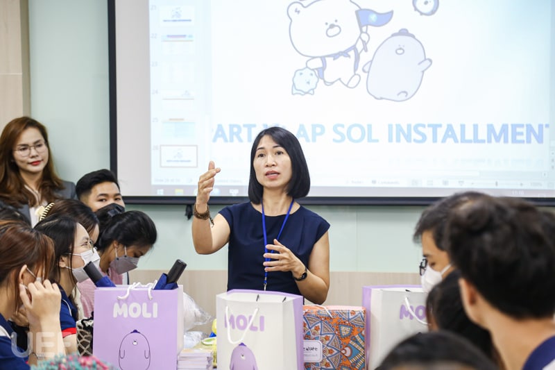 Chị Lê Anh mô tả những công việc mà phòng Chiến lược thương hiệu đã và đang làm. Từ cách xây dựng thương hiệu trong lòng khách hàng, cho đến những phương thức bán hàng đỉnh cao được áp dụng. Shinhan Bank tập trung đáp ứng đa số nguyện vọng của khách hàng trong lĩnh vực tài chính, ngân hàng. Chị cũng đưa ra một số video, TVC quảng bá hình ảnh thương hiệu và bán hàng để UEFers phân tích và học hỏi. Truyền thông đa kênh cũng là một phương thức Shinhan tập trung đẩy mạnh.