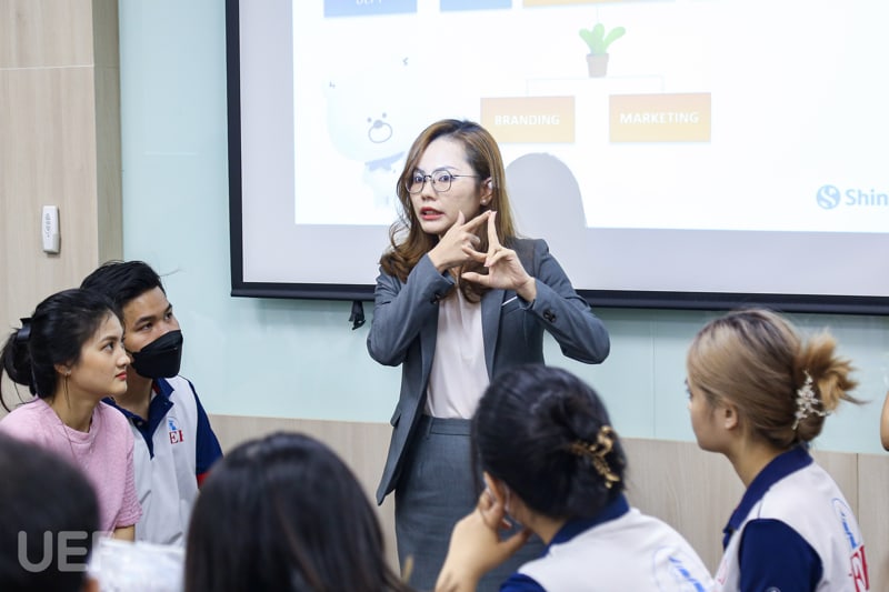 Đại diện UEF có sự đồng hành của ThS. Ngô Thanh Phương Quỳnh - Phó Trưởng khoa Marketing, ThS. Lê Thanh Hải - giảng viên Khoa Marketing cùng hơn 100 sinh viên đến tham quan, học hỏi. Về phía ngân hàng Shinhan, bà Nguyễn Thị Minh Thư - Giám đốc chi nhánh trực tiếp đón chào thầy cô và sinh viên UEF. Đồng hành với buổi chia sẻ còn có chị Đỗ Xuân Lê Anh công tác tại phòng Chiến lược thương hiệu Hội sở Shinhan Bank. Chị đã mang đến những bài học về marketing bổ ích của thương hiệu cho các bạn sinh viên.