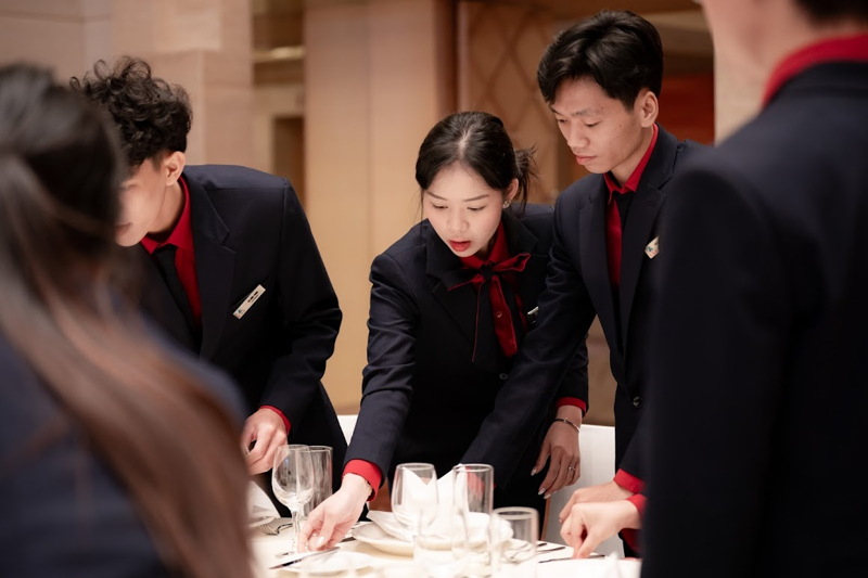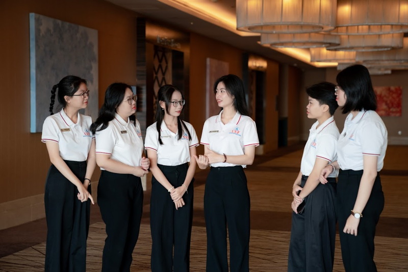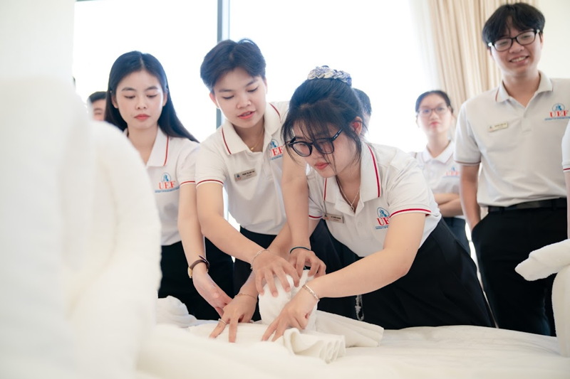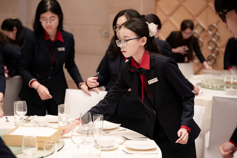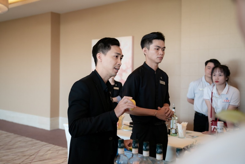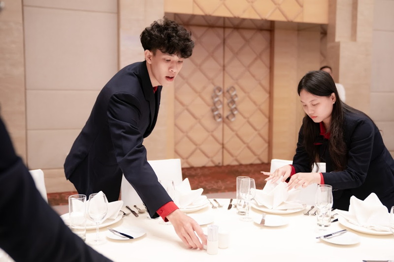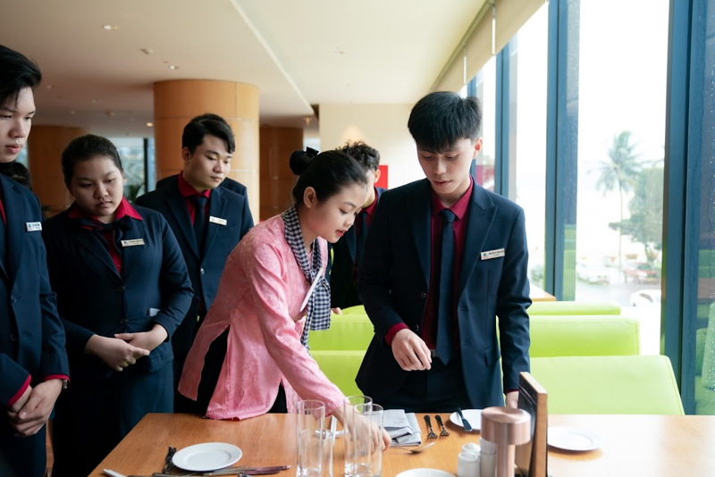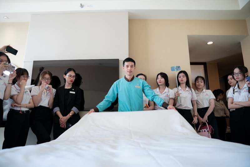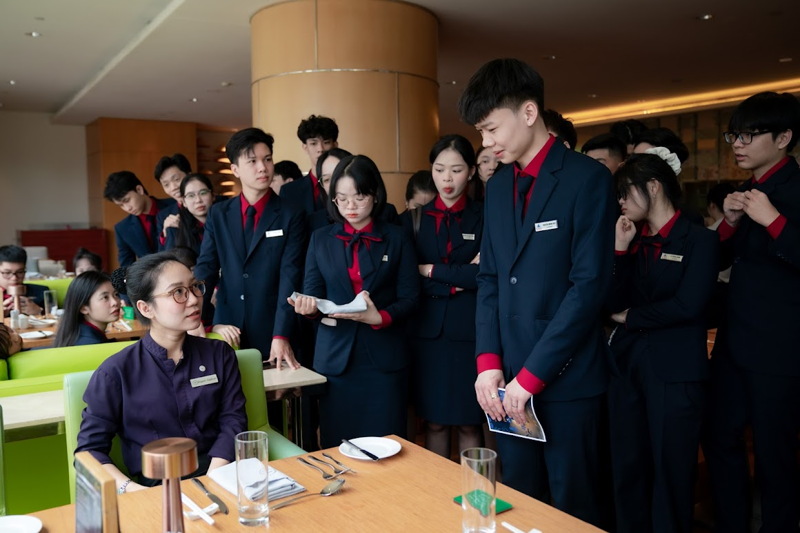 Thông qua chuỗi hoạt động thực hành như set-up bàn tiệc, thực hành pha chế, trang trí bánh, tìm hiểu quy trình buồng phòng hay tuân thủ nội quy vận hành khách sạn 5 sao, sinh viên được rèn luyện tư duy dịch vụ, kỹ năng quan sát, tác phong chuyên nghiệp và khả năng làm việc nhóm.
