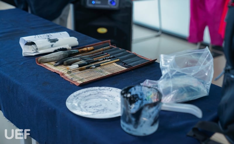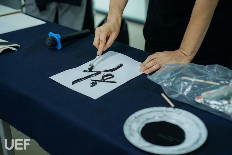 Trong buổi workshop, UEFers cũng đã được thưởng thức nghệ thuật viết thư pháp do chính nghệ nhân thể hiện bằng những vật dụng quen thuộc với chúng ta như: đũa, bàn chải, mascara, cây đánh phấn. Trước khi kết thúc buổi giao lưu, các bạn cũng được trải nghiệm viết thư pháp thú vị dưới sự hướng dẫn của nghệ nhân.
